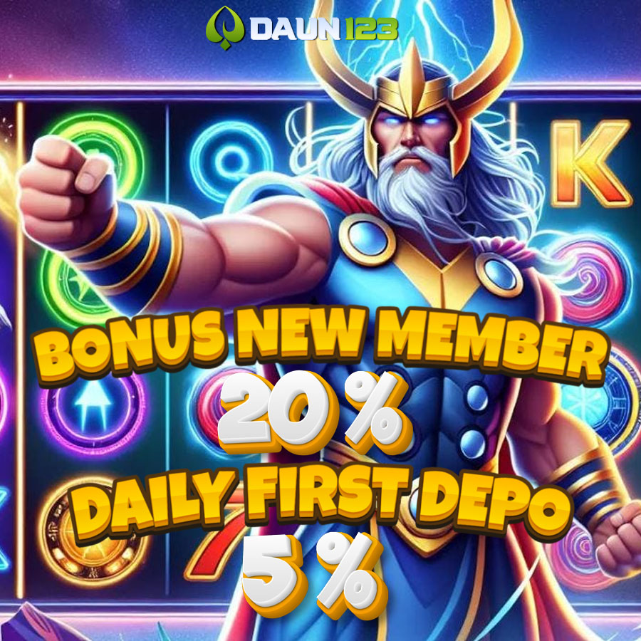 Terdapat bonus new member 20% bagi semua pemain baru. Selain itu, semua pemain akan mendapatkan bonus depo 5% untuk deposit pertama setiap harinya. Dan apabila anda berhasil mengajak teman anda untuk mendaftar dengan kode refferal anda, maka anda akan memperoleh bonus referral 0,2%. Serta berbagai bonus bulanan, harian hingga promosi khusus lainnya tersedia di situs judi daun123 online.